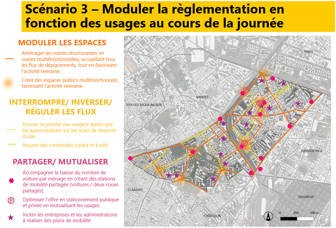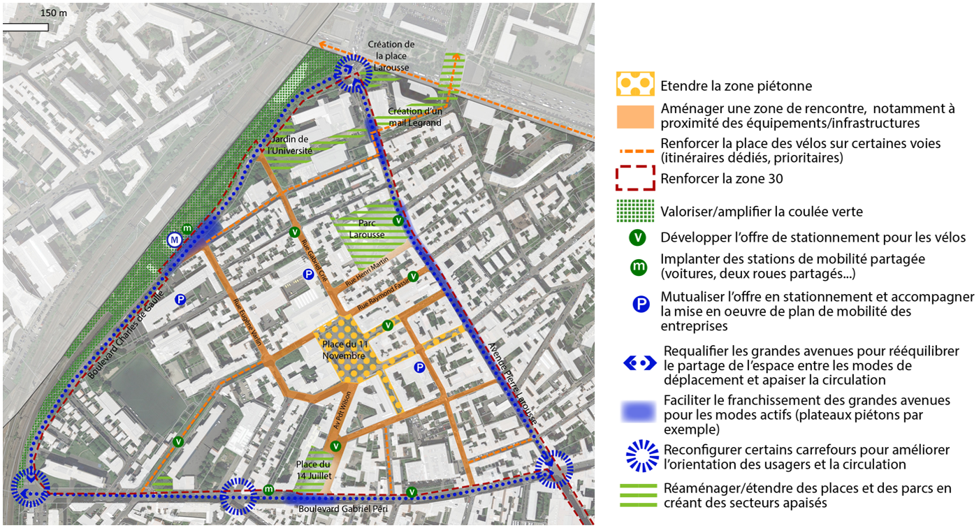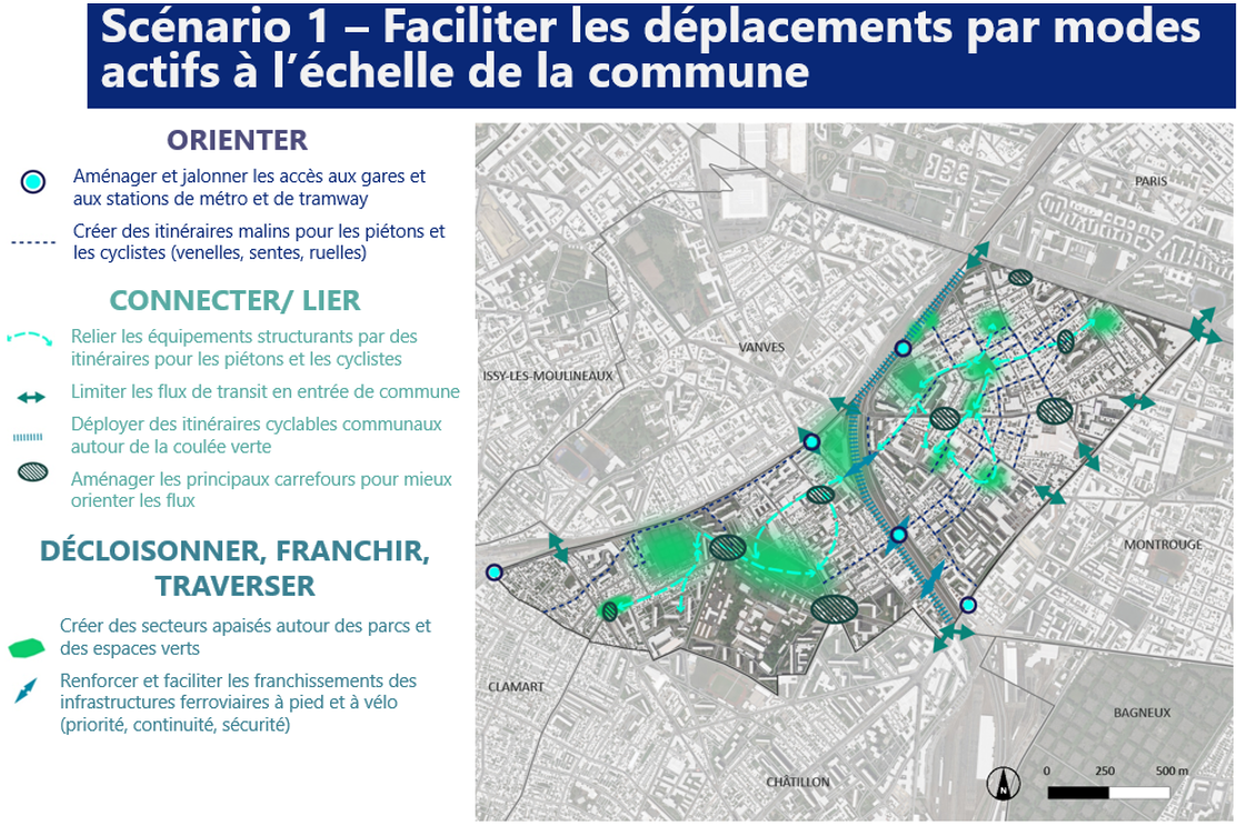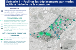Trois scénarios contrastés ont été étudiés puis soumis aux habitants via un questionnaire en ligne. Cette étape de concertation a mis en évidence un choix très net en faveur de l’un des scénarios. Celui-ci a ensuite été décliné en une vingtaine de propositions d’actions, décrites sous forme de fiches et de cartes, hiérarchisées selon trois niveaux de priorité en fonction des modalités de mise en œuvre, de l’échéance de réalisation et des impacts sur la mobilité.