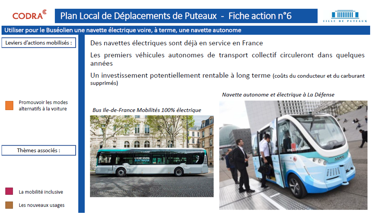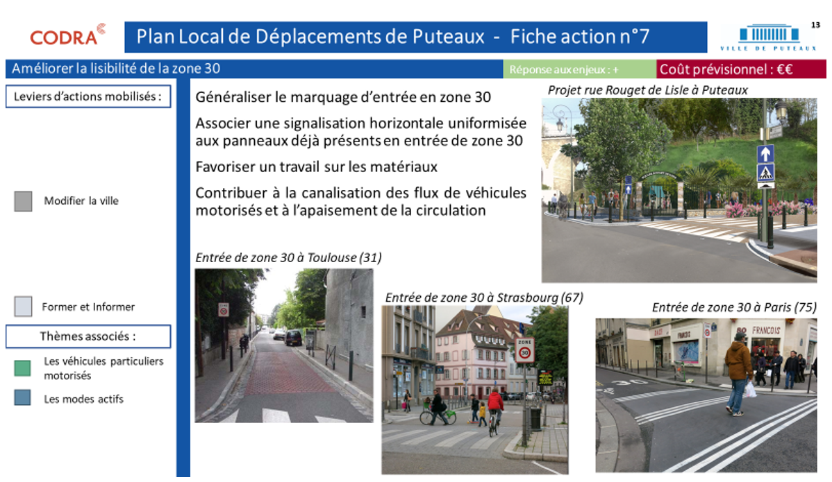 A l’issue de cette phase de diagnostic poussée, CODRA a produit un programme d’actions détaillé, incluant les budgets et les délais de mise en œuvre de chacune des actions proposées. Ces actions composent un projet de Plan Local de Déplacements de la Ville de Puteaux, feuille de route pour la programmation des travaux de voirie et d’espace public.