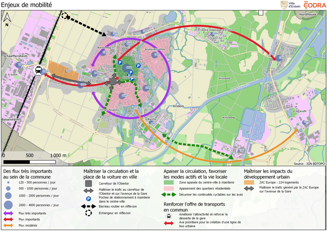Erstein constitue la centralité principale d’un bassin de vie au sud du Bas-Rhin, à 15 km de Strasbourg. Elle accueille plusieurs zones d’activités, un Centre Hospitalier et des équipements structurants, répartis sur 3 secteurs : centre-ville, gare SNCF et Krafft. La desserte ferroviaire est très performante, mais la desserte en bus reste plus faible, notamment pour les liaisons internes. L’apaisement du centre-ville est déjà amorcé, mais les liaisons en bus et les continuités cyclables restent à améliorer.