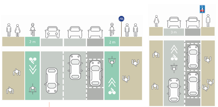 L’une des mesures phares du plan d’action consistait à transformer la rue principale du centre-ville en « vélorue », afin de mieux matérialiser la place des cyclistes sur la chaussée. Cette mesure a été expérimentée rapidement suite à l’adoption du Schéma en Conseil Municipal.